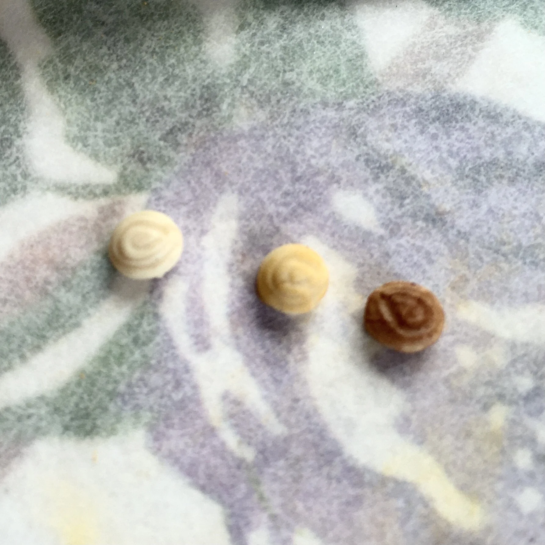 I mixed white clay with a tiny bit of yellow and brown to make an off-white mix. I pinched off a tiny amount and pushed it into the mould, smoothing off the top flat and removing any excess clay. I then pulled the sides of the mould around a bit to loosen the bun and popped the bun out using a pin to coax it. You may find it easier to lightly coat the mould with talcum powder first to get the bun out easily. Make as many as you want.