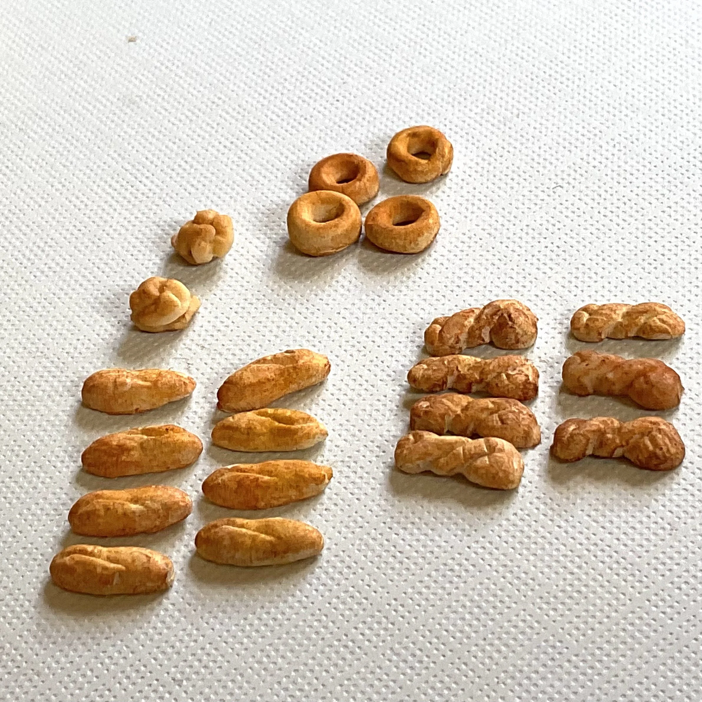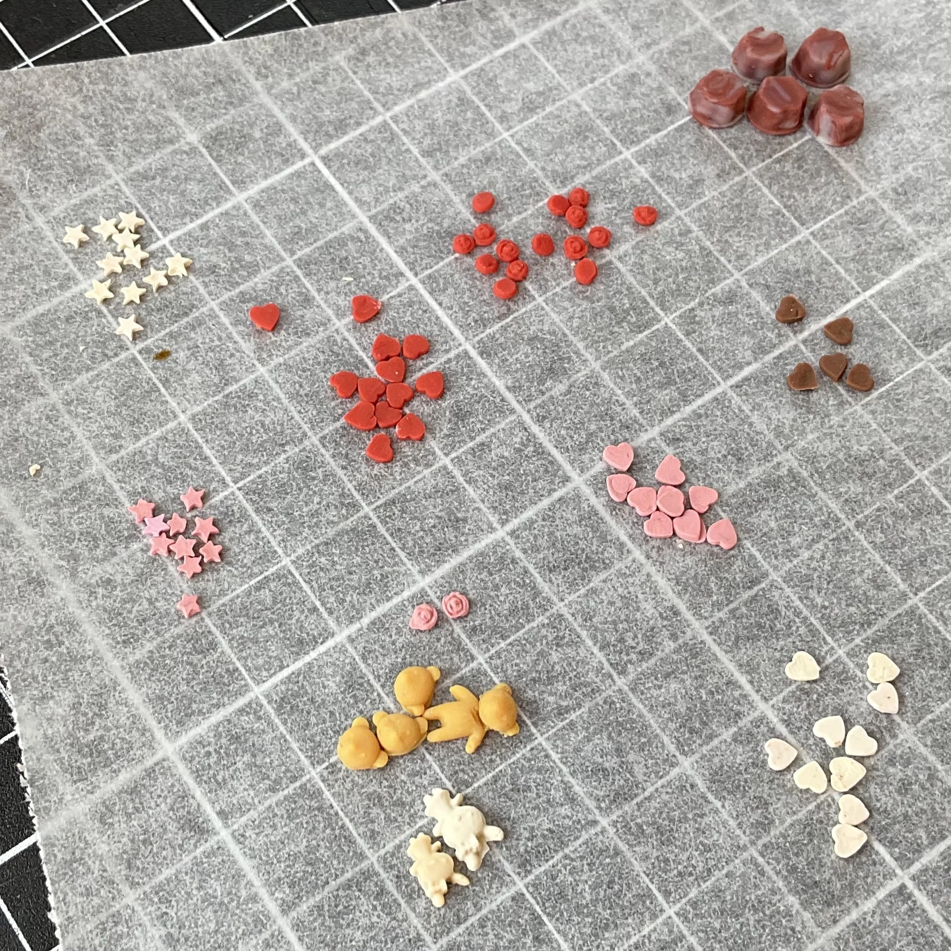 Make your shapes by rolling a tiny ball of clay and pushing into the moulds same as for making the buns. Make lots. They are handy to have. Then bake.