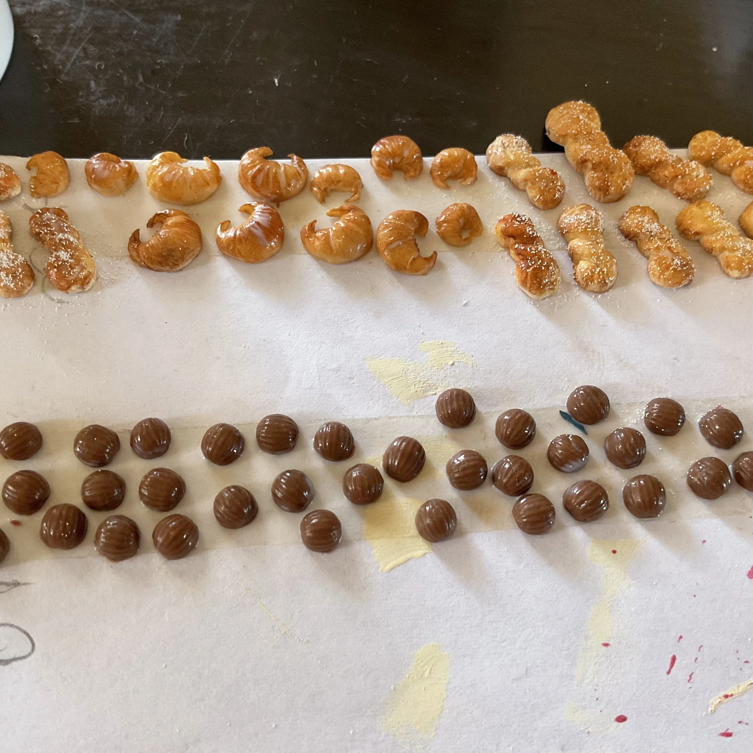 As an alternative, you could paint the buns after they are baked with acrylic craft paints, but I find it harder to get a good soft finish. Below are some cream puffs, eclairs, donuts and pastry twists, all made from nail art moulds and dusted with pastels.
