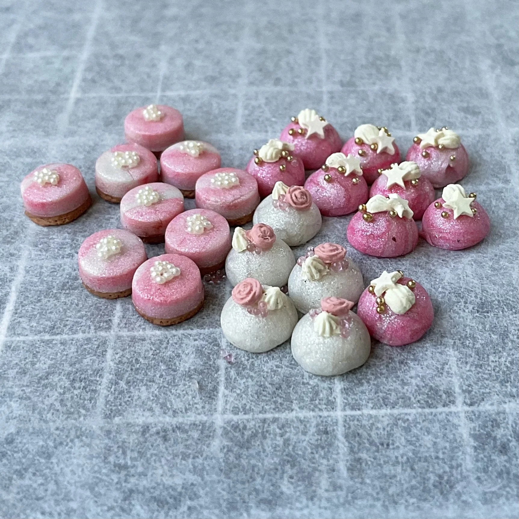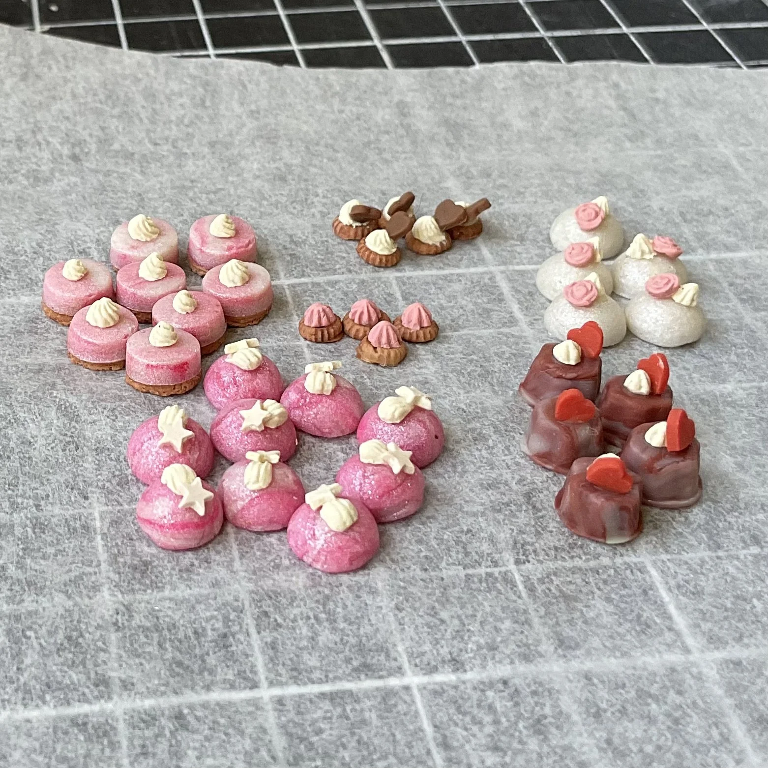 All the cakes in this photo were made with nail art moulds, except for the layered cakes on the front right.