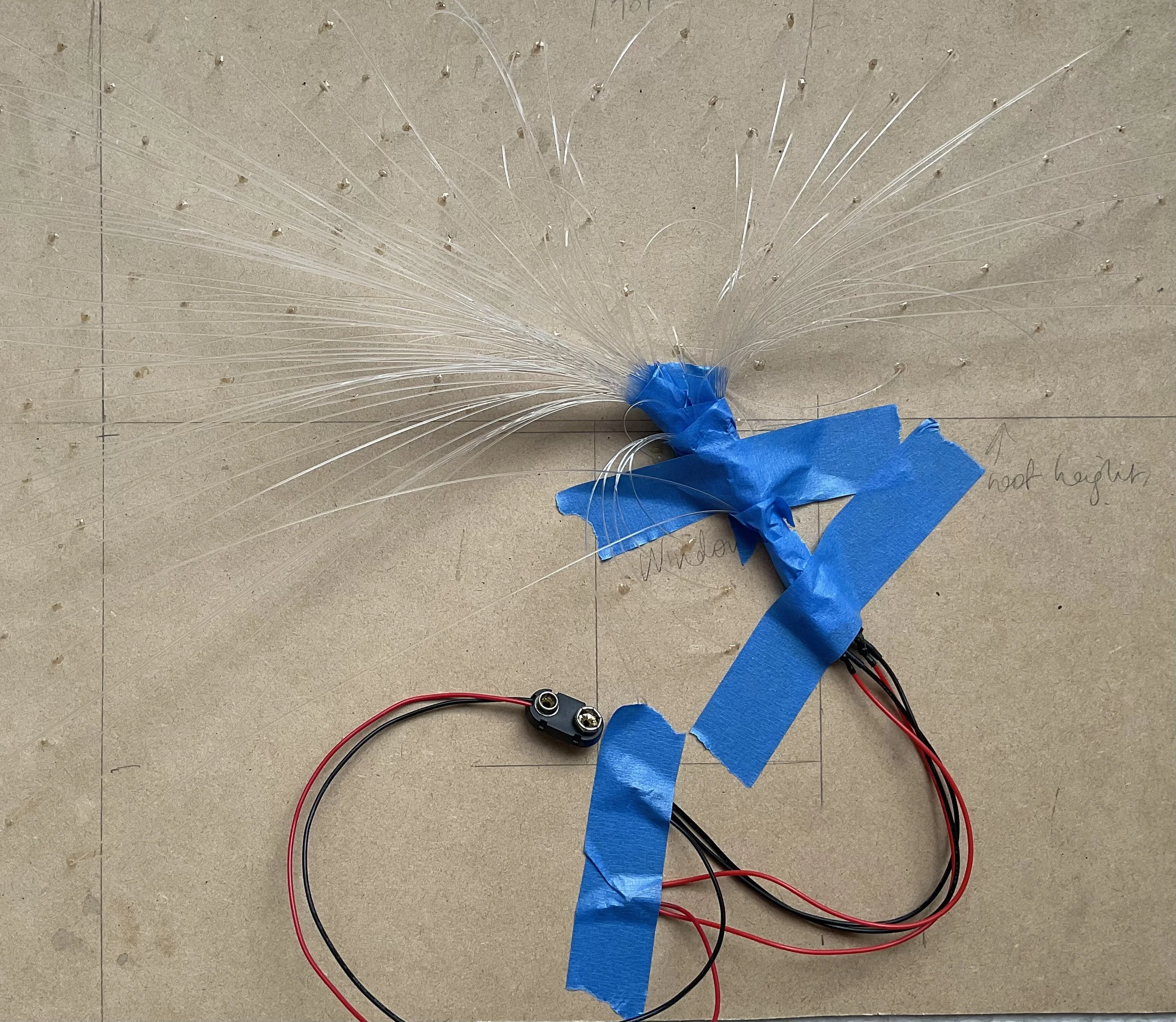 The back side of the night sky. Fibres are gathered together and taped to the LEDs (you can see where the LED wires are poking out under the tape on the right). The LED wires are soldered together with the battery pack wires under the tape at bottom.