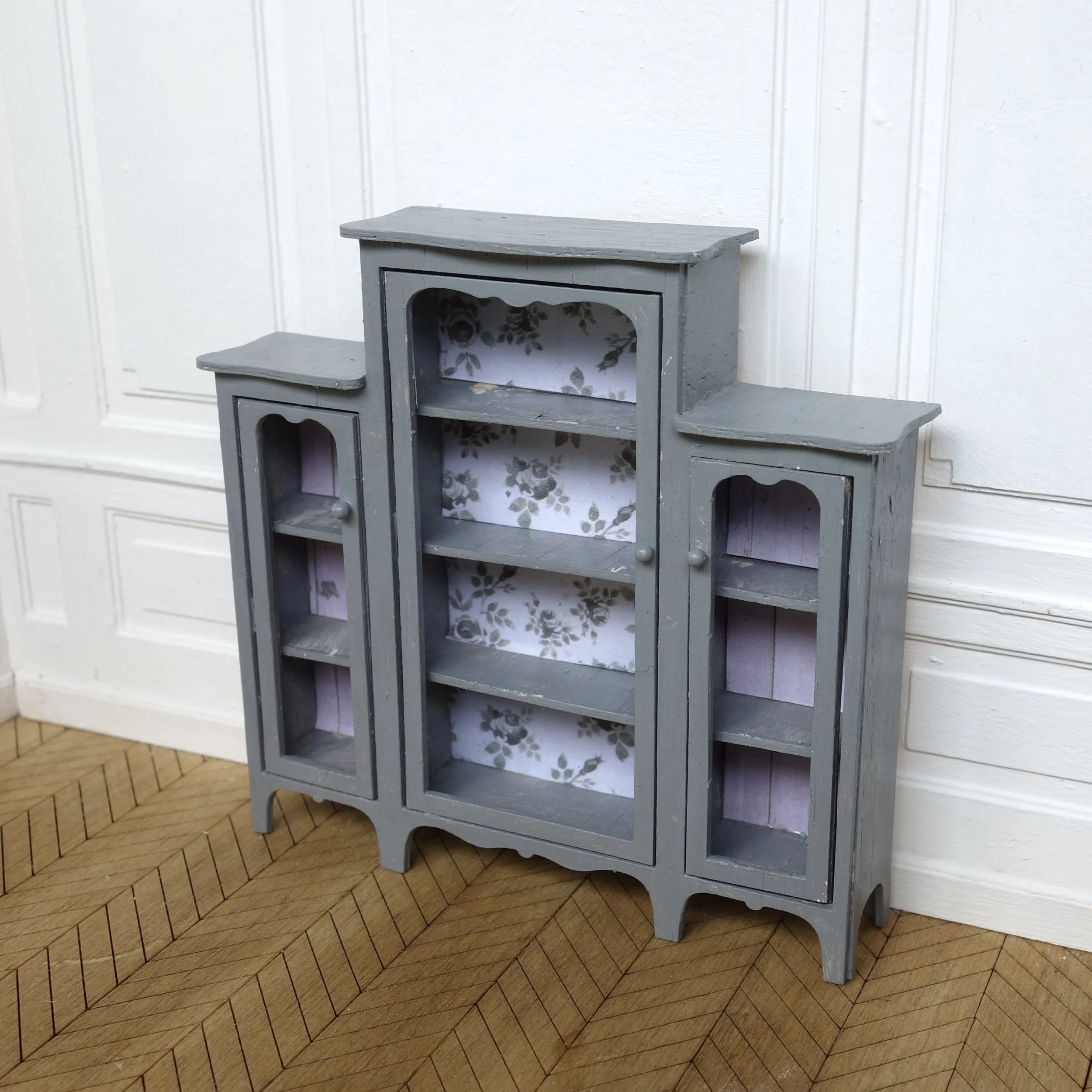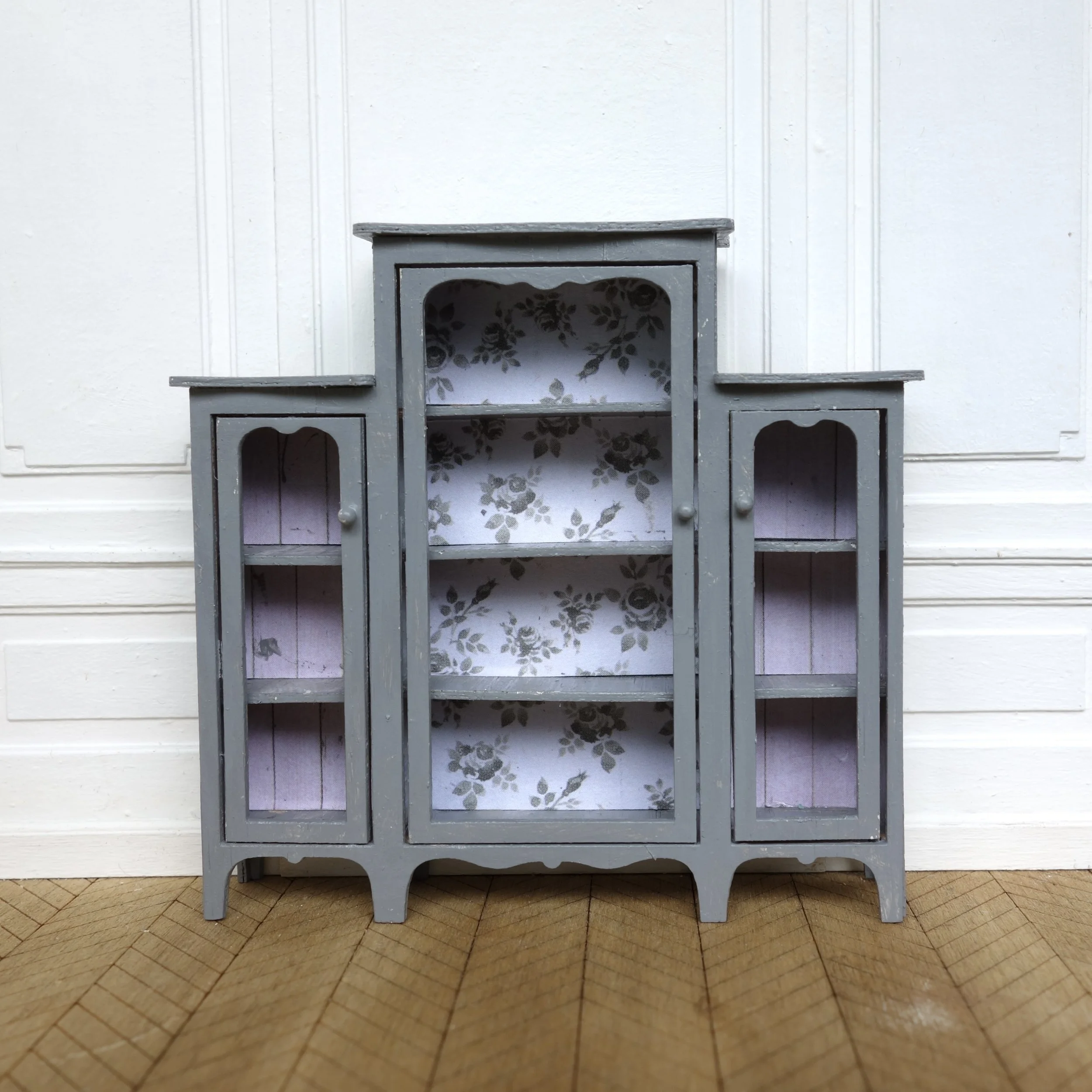 This kit makes a pretty larger display cabinet that would be perfect for your mini kitchen, dining room or living room, or even as a wardrobe in a bedroom. The three doors all open. There are additional matching display cabinets in different listed in my store, and these also match the cottage bookcases.